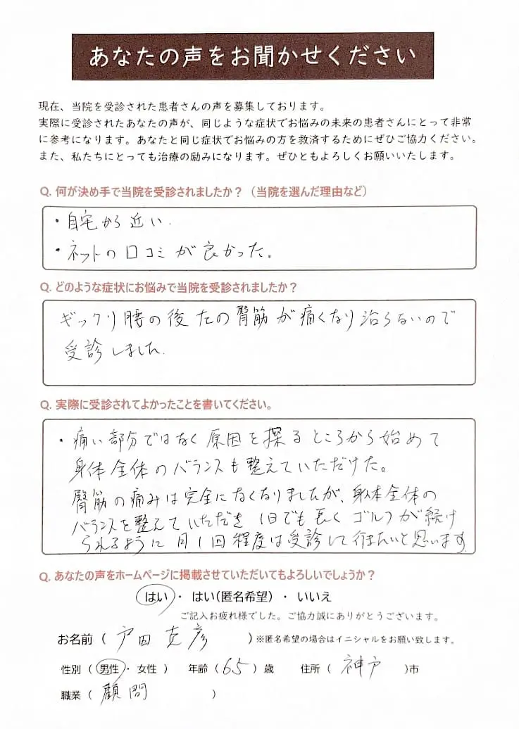 ギックリ腰後のお尻の痛みを解消。垂水区60代男性(患者様の声No.105)