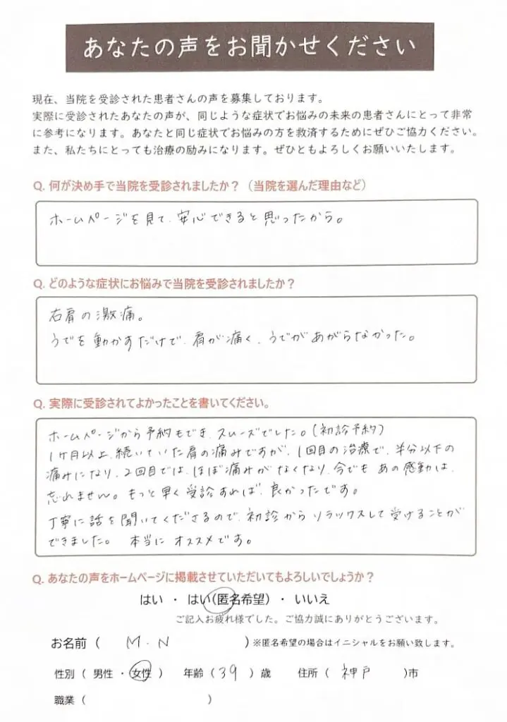 ご友人の紹介で来院されたOさん。右肘の痛みが5カ月以上続いており、病院に通院しても一向に良くならないとお悩みでしたが、約6回の治療で無事に解消されアンケートにご記入くださいました。