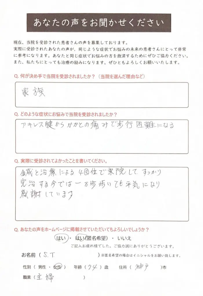 慢性的な腰痛、首、肩のこりを解消された垂水区の患者さまの声をご紹介