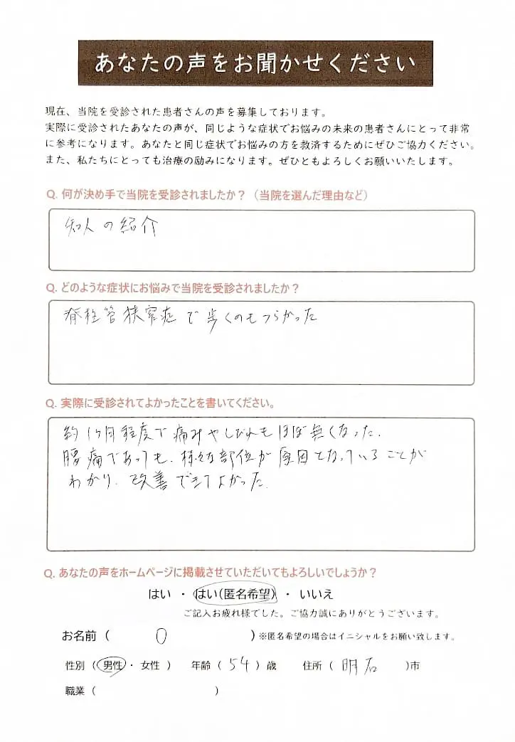 脊柱管狭窄症が改善。明石市50代男性(患者様の声No.114)